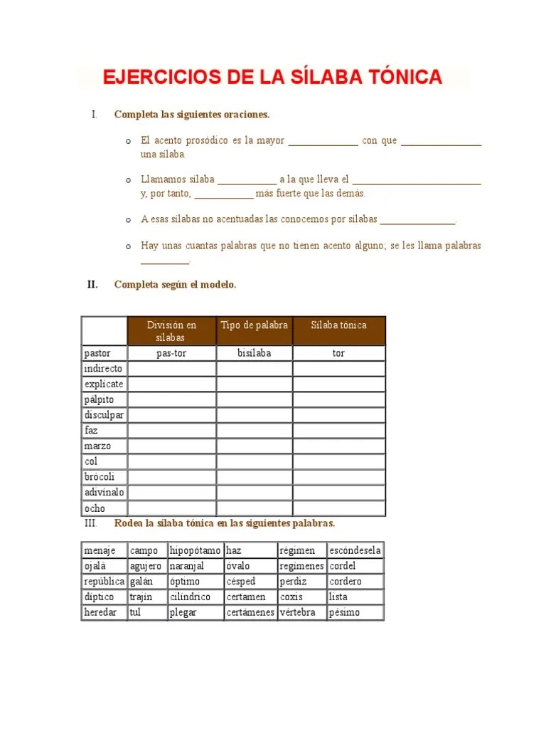 Ejercicios Silaba Tonica : 2 :. El resto de las sílabas que componen la palabra se . Las palabras se pronuncian con golpes de voz. Las demás sílabas de la palabra se llaman átonas. Esto va a depender de unas reglas de acentuación que se verán en la siguiente lección. Hoja 1 de ejercicios de reconocimiento de la sílaba tónica.